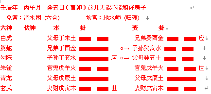 一个女人,不相信周易,报着试试看的心态,我摇得泽水困变地水师。卦虽然是我摇的,心却是对方发出的这个女人因为租房子,原来租的房子快到期了,不想续续租那房子,看能不能在最近几天租到满意的房子。租房子以父母为用神,卦里两个父母爻,未土和辰土,月生日帮扶旺相,有希望。再看卦里应为子孙发动变出房子丑土,应可以理解为新房东,应来跟自己相合,也说明能租到房子,卦里还有个酉金发动生应,又为兄弟,兄弟有朋友的意思,综合起来就是房子旺,应为别人主动跟自己相合,就是别人主动找上你的意思。卦里自己值空亡,明天就出空。看完卦后说,能成,明天就有希望。事实证明卦表达是正确的。此女听完后就接着找房子,走到一个小区门口,看见有房屋出租的信息,就上去看,一个老头走上来说,妹你你看房子呀,我给你介绍一套,那个房子是昨天才腾出来。结果就去看房了。相中了那套房子。第二天签的房子出租合同。事后反馈说这个老头要好处,去说让房东少点钱。兄弟为夺财之客,动于卦中,确实如此。