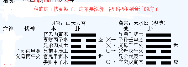 六神 伏神 本 卦 变 卦看房子看父母,父母午火值月建旺相,卦里父母伏藏于二爻,元神为寅木,可以解读为房子现租的租户,卦里兄弟两发动。世应之间兄弟发动,兄弟为阻隔之神,而应生世,为吉。结果卦主还是续租了原来的房子,想涨价的是房东的姐姐和妈妈。最后没有涨成价。