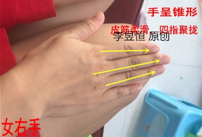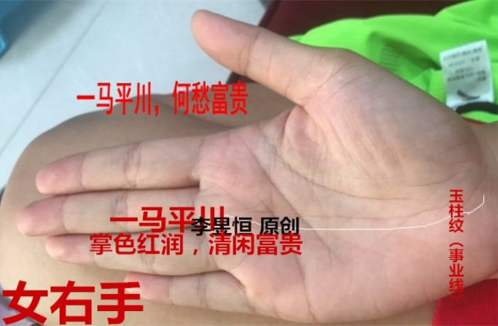 手相中三线深长、事业线直上,一般情况事业也相对稳定,财源不断。不论男女如果再出现“一马平川”的图纹,事业财运加倍,一生富贵有余,鞍前马后,叱咤风云之象。无论在商界还是在政界都会大显风采、独占鳌头。 “一马平川”的手纹,在实际预测中很少遇到富贵手纹,一生中衣食无忧、丰隆富足,并且时常出现贵人。由于性格直率,容易在感情上碰壁、是非。如果结婚线和感情线不佳,则容易出现婚姻危机。 1983年女士通过手相预测运势。 第一、皮筋柔滑,四指聚拢,龙虎相配,手呈锥型,一生富足清闲。(手相实例图片,禁止摘抄拼凑)