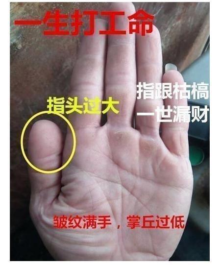 3、拇指代表人一生的福禄,拇指若是指头肥大,上无吉祥纹路,反而皱纹遍布,极伤财运。拇指指头肥大,说明此人性格过于老实、古板,不懂变通,容易受人牵制,喜欢听别人的意见行事,天生缺乏做老板、做领导的决断力。即使给个老板他来当,他也是无福消受,注定是一世的打工命