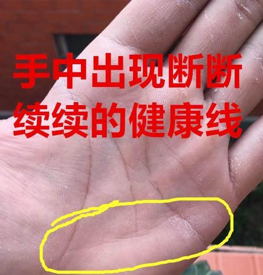 手相上出现了断断续续的健康线,健康线就是冲向小指的线路,没有健康线就说明身体是健康的,出现了说明你的身体正处于亚健康状态。你的健康线是断断续续的,断断续续是胃病,所以你要注意胃肠消化系统方面的问题。另外你整体的事业运、财运很不错,偏财运也很旺,但就是有一点你要注意防范,否则你财运再大都存不住财,就是你有破财漏财的现象,命中有财但就是守不住,可能是漏掉了,这个你就要注意防范