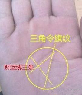 这个手相最明显的特征是有三角纹,这条纹理可谓是人的非常受欢迎的一条纹理,因为有这种能力的人一般财富很多,而且在年轻的时候事业有成,能够得到领导的赏识,同时在短时间内让自己的事业达到顶峰,收获很多的财富,生活也会因此变得更加好。 手中财运线深长,三条财运线从水星丘出发,向下延伸,其中一条财运线与智慧线相交,继续向下发展,又与生命线相交,形成了严密的三角令旗纹。此人必定一生钱财不缺,越老越有钱。