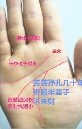 感情线过长过直,直冲巽宫,巽宫掌财运,被冲克则财运不稳,也影响事业运势,工作上虽然辛苦,但苦于进展缓慢,晋升无望,导致你频繁跳槽,更加不利于事业发展。智慧线深长,聪明智慧是有的,可惜事业线短小,聪明用不到点上,同样是不利于事业。由于你自认聪慧,也不甘心为人之后,苦苦挣扎几十年,折腾半辈子