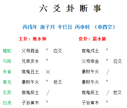 2.世爻代表问测者,是临妻财爻(钱财)生官鬼爻(工作),也就是自己急于找工作;应爻为所问之事,应爻酉金也是空亡,但能化回头生,即所问的事情目前落空,在酉日填实可得;