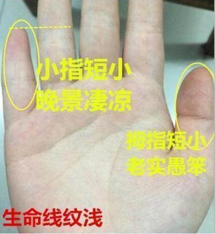 小指只能到达无名指的最后一节的指节线,过短之象,子女缘分浅薄,容易晚景凄凉。拇指也过于短小,看起来很笨拙,说明女士性格老实,聪慧不足,甚至有点愚笨,不是投资做生意或者做事业的材料,多数会在家养儿育女,但是在家的地位不高,丈夫大男人,孩子顽皮不懂体谅母亲,婚姻生活也十分不如意