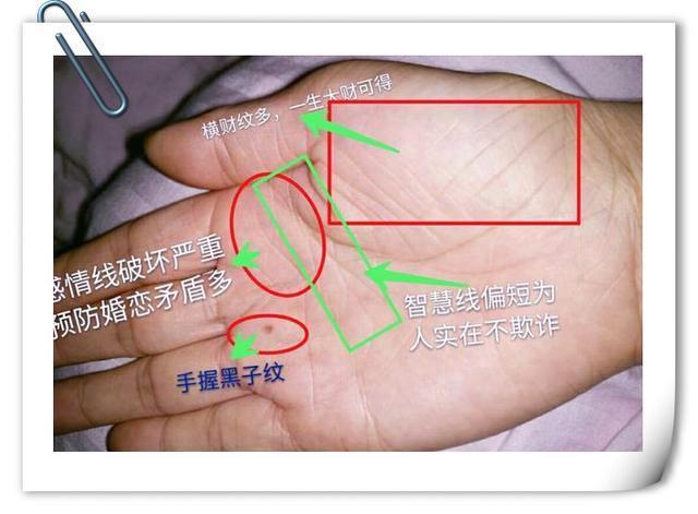女人手相如有黑子纹,一生中必然会有意外之财。手相中横财纹多,可以从事偏门行业。 手相中智慧线偏短的人为人实在,心机不重,一生可以得贵人朋友帮村。手相感情线太乱的一生感情不是很如意,只能通过自身八字命理补充手相不足。